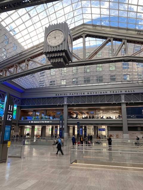 One bright spot on NYC’s tourism front, was the opening of the Moynihan Train Hall on New Year’s Day. It’s a handsome, $1.6 billion extension of Penn Station, located in the old post office, James A. Farley building (a remake of what was the original Penn Station, before it was demolished in 1963. ) You can see more images of Moynihan Train Hall here on my Instagram page. It has a lovely, almost retro glam style Amtrak lounge; one can also get access to the LIRR.